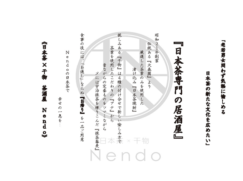 『老若男女問わず気軽に愉しめる日本茶の新たな文化を広めたい』 伝統ある「大森園」より厳選した茶葉のみを使用した漬け込み【日本茶焼酎】オーダー頂いてから焚く、【焚きたて抹茶ビール】を呑みながら鮮魚を干した後 茶葉と共に一度真空にし、じっくり低温調理で干物全体に香り・旨味を含ませてから丁寧に焼き上げる 日本茶専門店のNendoならではの新しい干物をアテに愉しむ茶屋×酒屋=茶酒屋です。